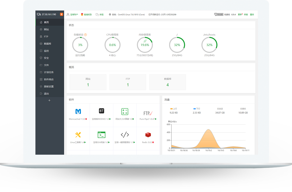 内存要求:内存要求最低512MB,推荐768MB以上,纯面板约占系统60MB内存